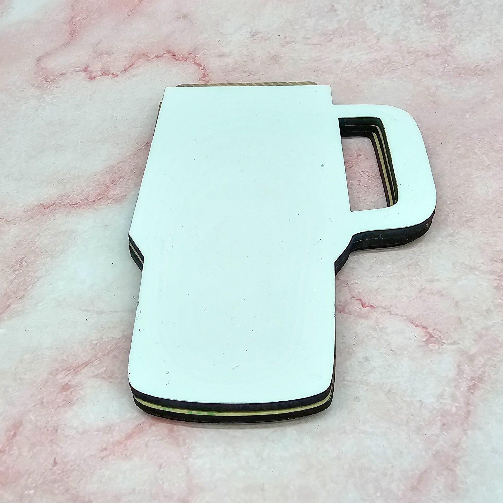 - Assemble by peeling off double-sided tape off one side of the wooden spacer, stick onto sublimated base, peel tape off other side of the wooden spacer, stick top sublimation piece on and press together hard with your hands