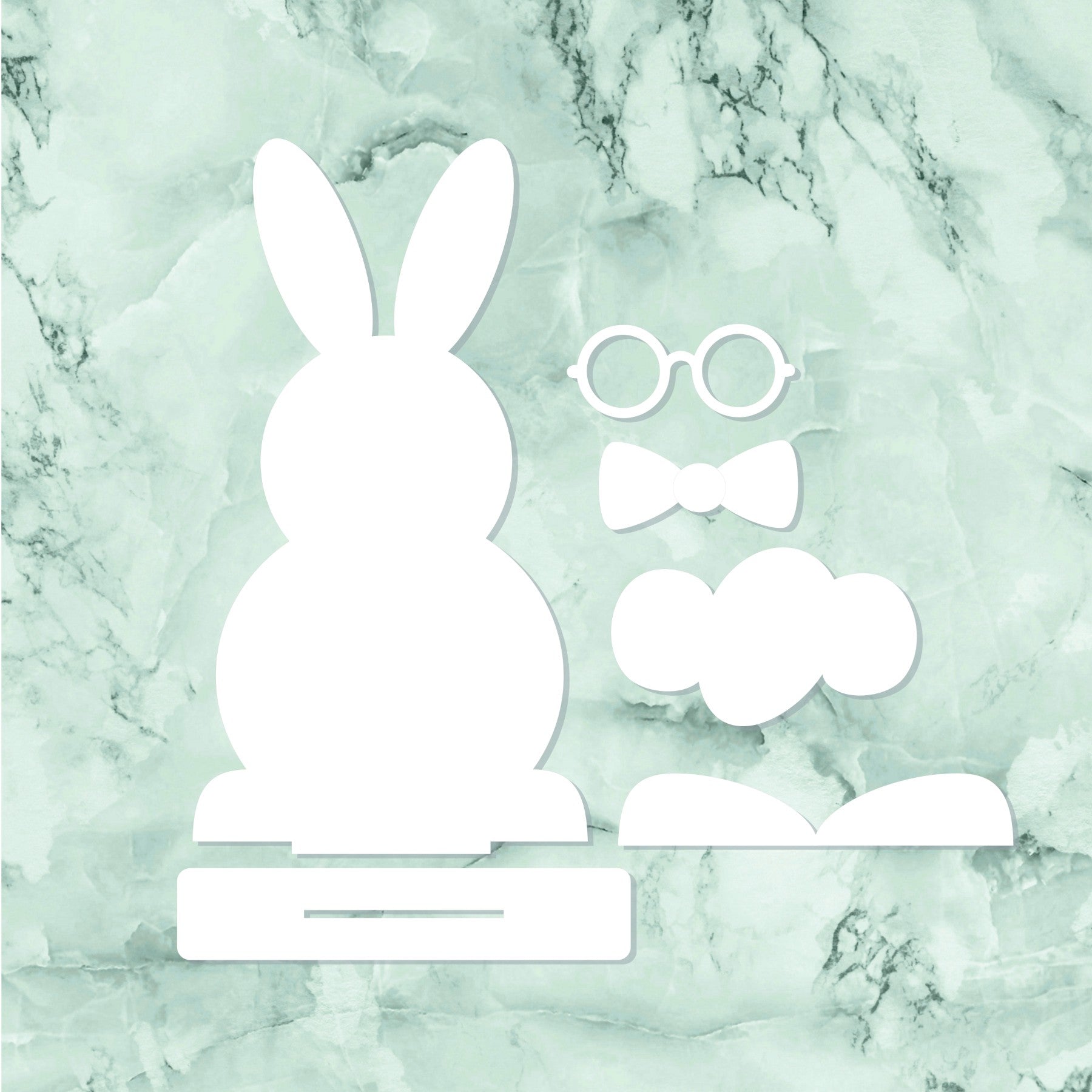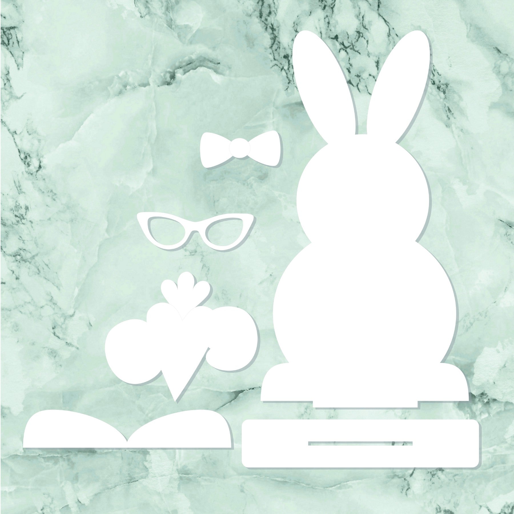 - Pieces include bunny base, stand, and 3d embellishments