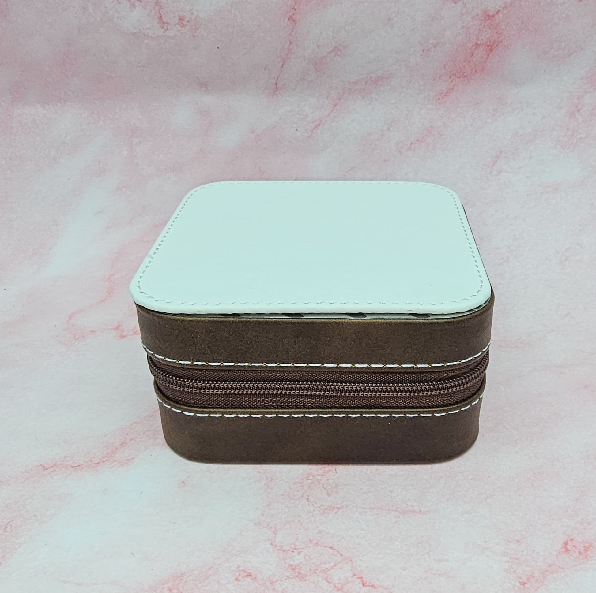 - Jewelry case with zipper closure and brown interior
