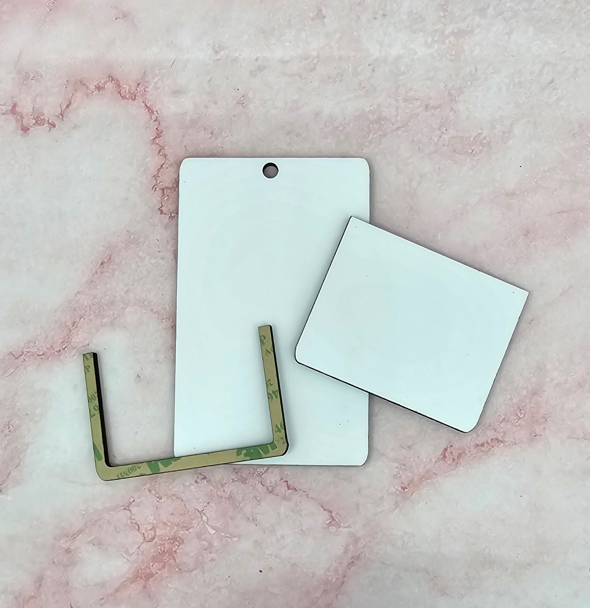 - Gift card kit includes a sublimation blank base, a wood spacer with double-sided tape, and a sublimation blank top piece